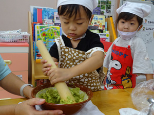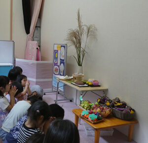 中秋の名月、今年は10月6日。 少し早いですが、園でお団子作り。 秋の収穫を喜び、感謝して お供えをするよ…。 めろん、みかん、ぶどう組さん、 可愛い手で、 ひとつひとつ丁寧に丸めます。 「やわらかいね!」 「ぷにゅぷに…